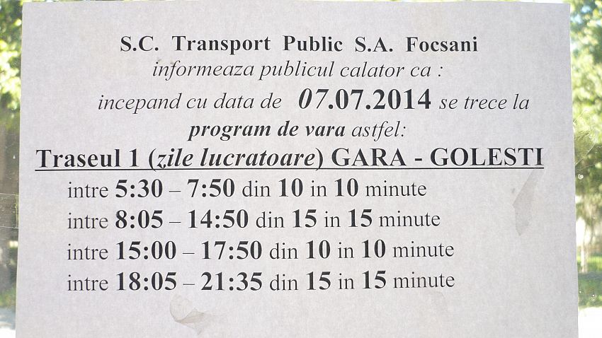 Reprezentanţii SC Transport Public SA Focşani anunţă călătorii care obişnuiesc să meargă pe ruta Gară-Goleşti că de luni, 7 iulie, maşinile vor circula în funcţie de programul de vară, pentru a răspunde necesităţilor celor care merg spre muncă dis-de-dimineaţă şi revin după-amiaza.