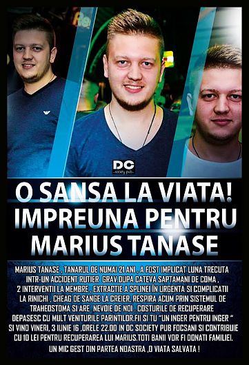 Prietenii unui tânăr de 21 de ani din Focşani, implicat într-un accident rutier produs luna trecută, în Movilita, Galati, au lansat o campanie umanitară prin care şi-au propus să adune banii necesari intervenţiilor chirurgicale şi a tratamentelelor pe care acesta trebuie să le rumeze pe termen lung. Astfel, “Dc Society Pub vă invită vineri 3 iunie începând cu orele 22.00 să-l susţinem pe Tanase Marius, tânărul de numai 21 ani care fost implicat luna trecută într-un accident rutier grav. După câteva săptămâni de comă, două intervenţii la membre, extracţie a splinei în urgenţă, complicatii la rinichi, cheag de sânge la creier, prietenul nostru respiră acum prin sistemul de traheostoma şi are nevoie de noi. Costurile de recuperare depăşesc cu mult veniturile părinţilor. Fii şi tu “Un Înger pentru un Înger “ şi vino Vineri, 3 iunie 16 ,orele 22.00 în DC Society Pub Focşani şi contribuie cu 10 lei pentru recuperarea lui Marius. Toţi banii vor fi donaţi familiei". Tânărul a fost rănit de o dubita în timp ce mergea cu scuterul, iar ancheta poliţiei nu a stabilit deocamdată cine este vinovat de producerea accidentului. (D.C.)