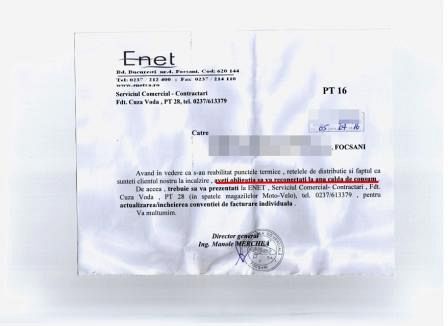 ENET vrea să îi oblige pe toţi cetăţenii oraşului Focşani să se rebranşeze la apă caldă, indiferent dacă au nevoie sau nu de acest serviciu, sub ameninţarea că dacă nu vor acest lucru nu vor mai avea căldură la iarnă. De două zile, în cutiile poştale ale cetăţenilor din Focşani au apărut adrese cel puţin bizare din partea societăţii SC ENET SA. Locatarii sunt informaţi că au obligaţia să se prezinte la sediul ENET pentru a se rebranşa la apa caldă, în condiţiile în care sunt clienţii societăţii la sistemul de încălzire centralizată. Prima întrebare pe care şi-au pus-o cetăţenii a fost cum de noii aleşi din Consiliul Local au putut vota o asemenea aberaţie. Numai că, surpriză, nimeni din autorităţile locale nu are cunoşţinţă de decizia luată de directorul ENET, Manole Merchea. Fostul subprefect de Vrancea, ce a fost schimbat din funcţie după ce fiul său a intrat cu maşina Prefecturii în gardul Stadionului “Tineretului”, a decis de unul singur să oblige focşănenii să se reconecteze la apa caldă. Mai mulţi focşăneni ce au boilere în casă şi îşi încălzesc apa cu energie electrică, s-au arătat revoltaţi de intenţia SC ENET, pentru că în cazul în care nu vor apă caldă, atunci societatea îi va lăsa fără căldură la iarnă. Chiar viceprimarul Focşaniului, Marius Iorga, se află printre cei care au fost anunţaţi că sunt obligaţi să semneze contractul cu ENET-ul. “Am primit şi eu o asemenea adresă. Am şi eu boiler. Cei de la ENET nu au acest drept. Probabil o să-şi piardă şi clienţii pe care îi mai au! Este ilegal din două motive. În primul rand pentru că ENET-ul a fost de acord cu debranşarea cetăţenilor. Reprezentanţii societăţii şi-au dat acordul pentru debranşarea locatarilor. În plus, cei de la ENET nu pot lua decizii în ceea ce priveşte servicile oferite fără acordul Consiliului Local, în condiţiile în care primesc finanţare de la CL. Vom discuta cu reprezentanţii ENET”, ne-a spus Marius Iorga.