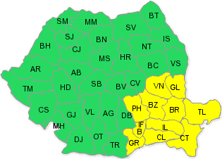 Intervalul de valabilitate este 09 noiembrie, ora 09:30 - 10 noiembrie, ora 12:00. Fenomene vizate sunt ploi moderate cantitativ, intensificări ale vântului, ninsori în zona montană înaltă. În intervalul menţionat, vor fi precipitații în cea mai mare parte a ţării. În sud şi sud-est va ploua mai ales sub formă de aversă, se vor semnala descărcări electrice, iar cantităţile de apă vor depăşi local 15...20 l/mp. Vântul va prezenta intensificări în sud-estul teritoriului, unde viteza la rafală va depăşi temporar 50...55 km/h, iar pe litoral 60...70 km/h. La munte, mai ales la altitudini mari, vor predomina ninsorile, iar vântul va avea intensificări, viscolind ninsoarea. În Dobrogea, cea mai mare parte a Munteniei şi în sudul Moldovei vor fi intervale de timp în care ploile vor fi abundente, iar cantităţile de apă vor depăşi local 25 l/mp şi izolat 50...60 l/mp. (Z.V.)