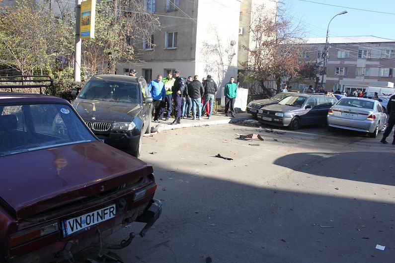 O tamponare în care au fost implicate nu mai puţin de şapte autoturisme a avut loc în cartierul Sud, ieri, în jurul pranzului. Poliţia a fost anunţată de eveniment cu puţin timp înainte de orele 12, prin 112. Accidentul a avut loc după ce un şofer a dorit să facă o depăşire neregulamentară. Şoferul BMW a reuşit performanţa negativă de a lovi şase maşini, dintre care cinci parcate, una fiind chiar pe cea pe care încerca să o depăşească. Incidentul a avut loc pe strada Revoluţiei. Poliţiştii au stabilit că Sorin Oprea, 20 ani, din municipiu, aflat la volanul unui BMW 730, un bolid de 3000 de centimetri cubi şi sute de cai putere, s-a angajat în depăşirea unui Opel Corsa şi a acroşat o Dacia 1310 parcată pe partea stangă a drumului. Următoarea maşină lovită a fost un BMW X 3, care, aşa cum spun martorii, a fost efectiv aruncat în aer şi mutat la aproape 180 de grade. După impact, maşina care a provocat tamponarea a ricoşat în Opelul pe care încerca să-l depăşească, avariindu-l pe partea stangă. Alte trei maşini parcate paralel cu Dacia şi X3, respectiv un VW Passat, un Mercedes C240 şi un Matiz au fost avariate de maşina care a încercat să depăşească. “Accidentul a avut loc pe fondul unei depăşiri neregulamentare efectuate de şoferul unui autoturism BMW. Acesta a rămas fără permis de conducere”, ne-a spus inspectorul Săndel Stoica, de la Biroul Poliţiei Rutiere Vrancea.