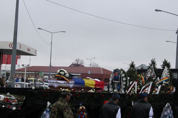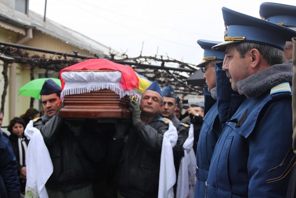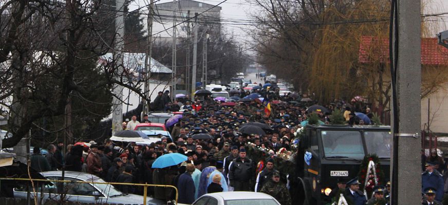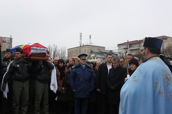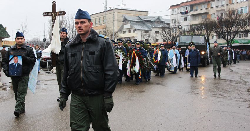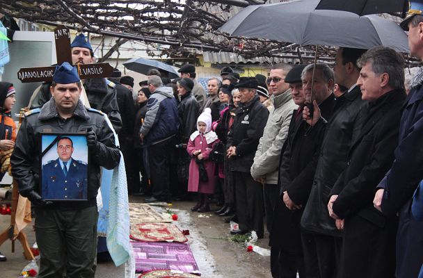 Lacrimi şi durere la Adjud! Sute de persoane s-au adunat la ultimul zbor al plutonierului Vasile Manolache pentru a-i spune „drum bun” spre înaltul cerului. Trupul neînsufleţit al militarului din Adjud, care a murit în urma accidentului aviatic ce s-a produs la marginea comunei băcăuane Bereşti – Bistriţa, în timpul executării unui zbor în formaţie, a fost condus ieri pe ultimul drum. Sute de oameni, rude, prieteni, cunoscuţi şi colegi de la Flotila 95 de aviaţie militară Bacău au venit să îi aducă un ultim omagiu celui ce a fost Vasile Manolache, fiu, soţ şi tată a unui băiat de şase ani. La funeralii a fost prezent şi ministrul Apărării, Mircea Duşa, care a vrut să fie alături de familia îndoliată în aceste momente grele. Mircea Duşa, dar şi autorităţile locale şi judeţene au venit la casa părintească a militarului, unde a fost depus sicriul, să îi aducă un ultimul omagiu militarului care s-a stins din viaţă mult prea devreme.