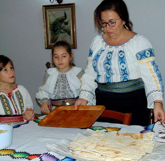 „Când eram de vârsta, ta mama mea m-a învăţat să fac turte..., ea a învăţat de la mama ei... Acum e vremea ta înveţi. Să vezi ce mult or să-ţi placă turtele făcute de mâna ta, or să aibă un gust mult mai bun”, spune doamna Cristina care şi-a chemat şi nepoatele s-o ajute la treabă.