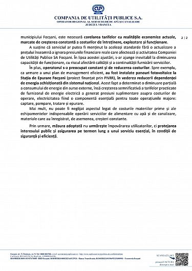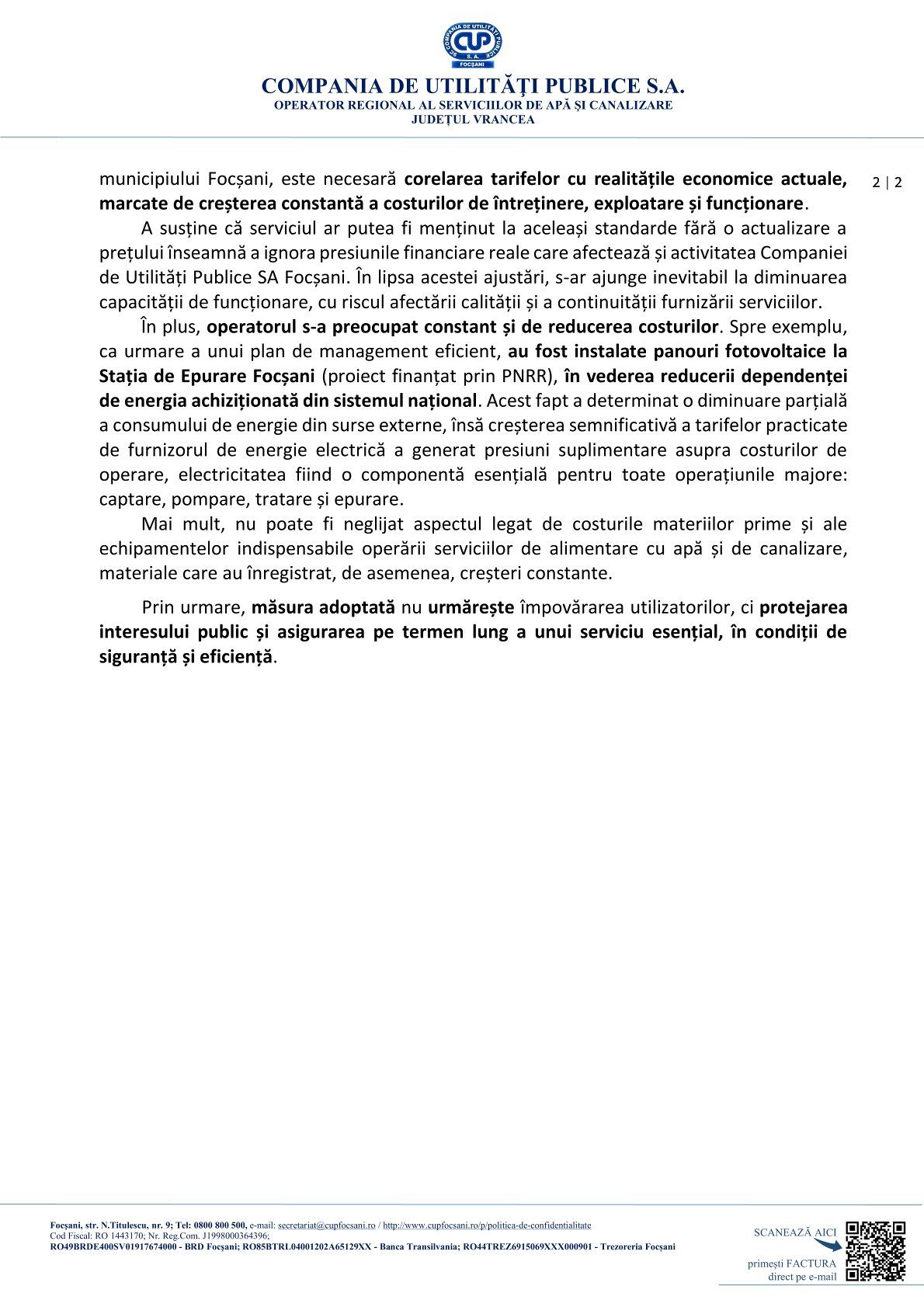 În acest context, CUP amintește și de instalarea panourilor fotovoltaice la Stația de Epurare Focșani, proiect finanțat prin PNRR, menit să reducă dependența de energia achiziționată din sistemul național.