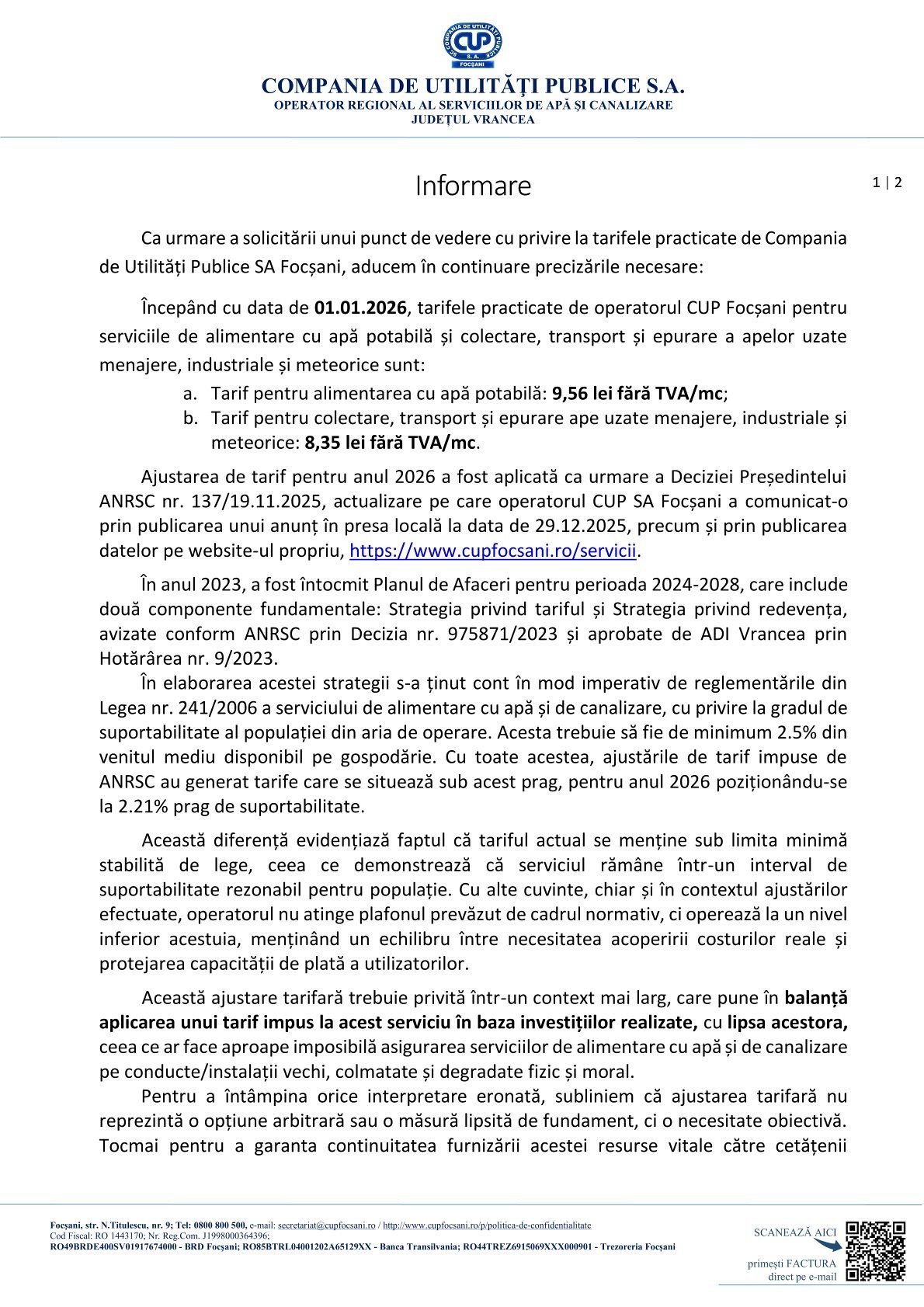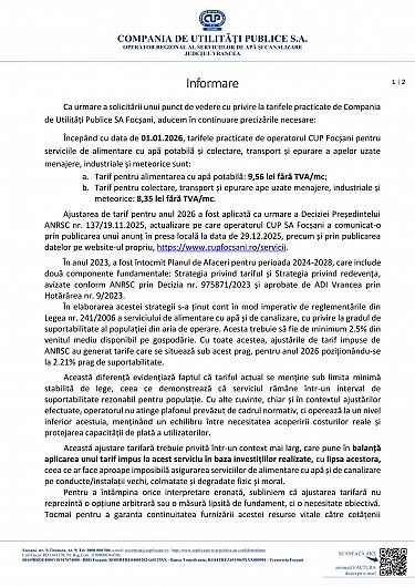 Ajustarea tarifară pentru anul 2026 a fost aplicată în baza Deciziei președintelui ANRSC nr. 137/19.11.2025, fiind anunțată public la finalul anului trecut atât în presa locală, cât și pe site-ul operatorului.