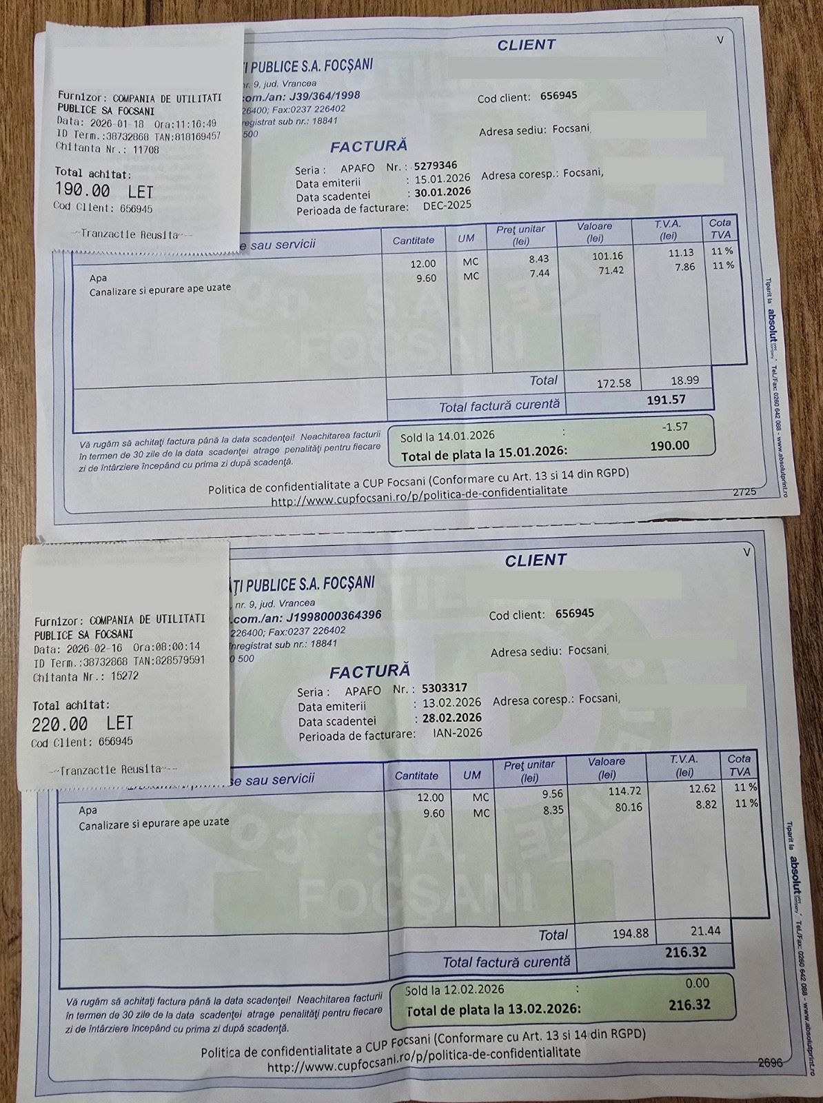 Potrivit documentelor trimise redacției, pentru un consum de 12 mc apă și 9,6 mc canalizare, valoarea totală de plată a crescut de la aproximativ 190 lei (factură emisă în ianuarie 2026, pentru consumul din decembrie 2025) la peste 216 lei (factură emisă în februarie 2026, pentru consumul din ianuarie 2026).