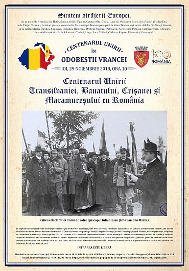 Primăria și Casa de Cultură din Odobești vă invită joi, 29 noiembrie 2018, la aniversarea Centenarului Unirii Transilvaniei, Banatului, Crișanei și Maramureșului cu Regatul României, act istoric realizat pe 1 Decembrie 1918, la Alba-Iulia.