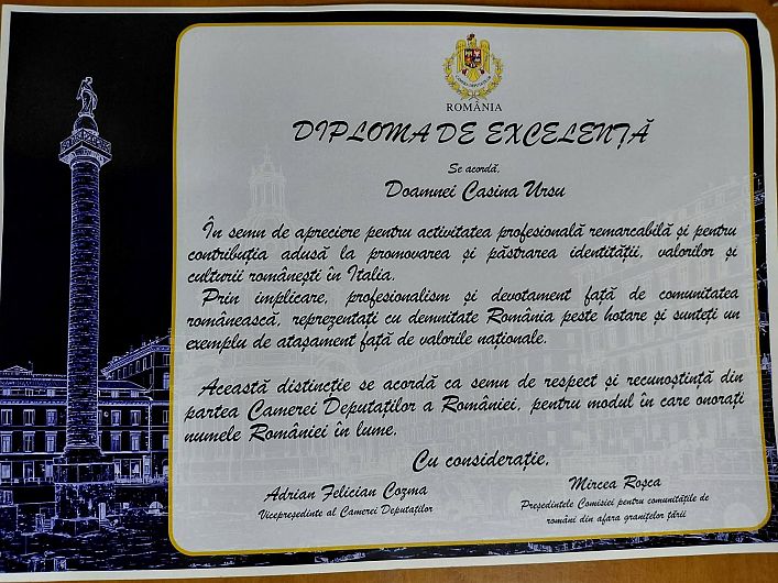Cu această ocazie, am avut onoarea de a primi o Diplomă de Excelență, pe care o dedic familiei mele și întregii comunități. Este o recunoaștere care mă onorează și mă motivează să continui.