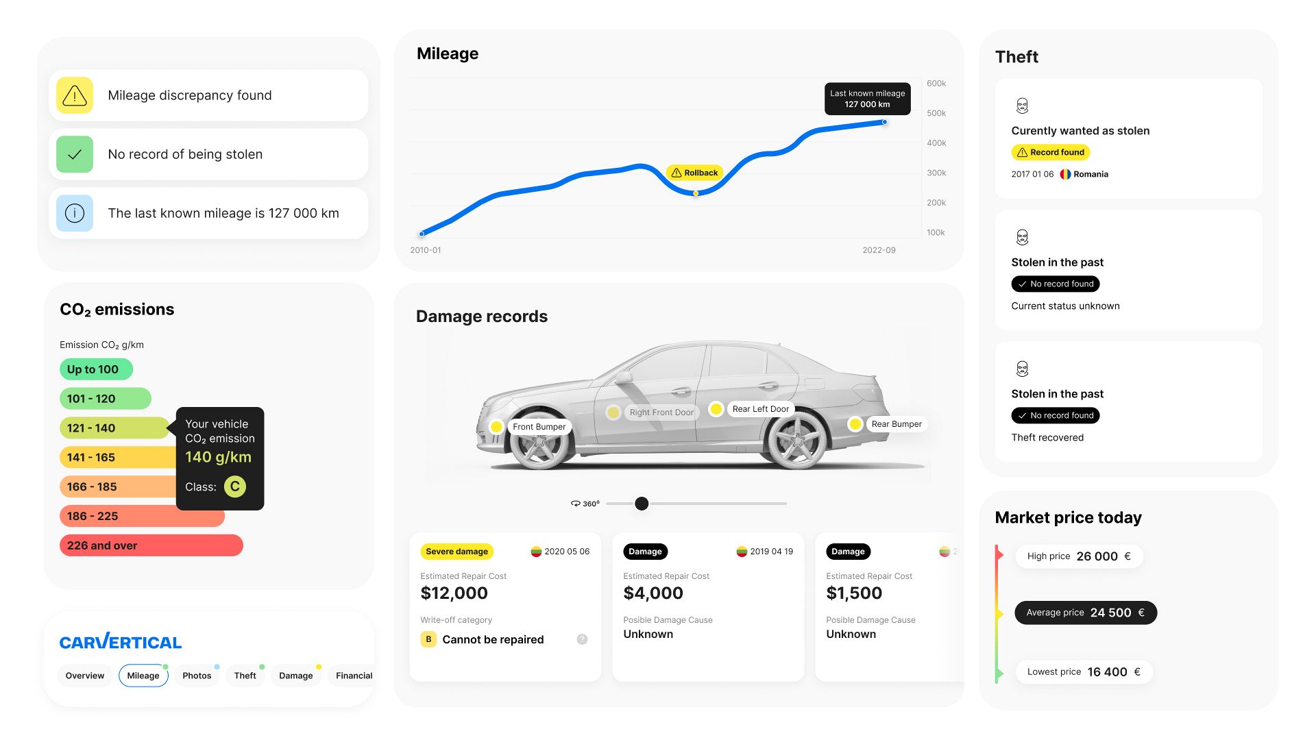 carVertical este o companie globală de date auto. Aceasta generează rapoarte despre istoricul vehiculelor folosind date din sute de registre și baze de date naționale și private din întreaga lume pentru a oferi clienților informații detaliate despre orice vehicul de care sunt interesați, inclusiv istoricul kilometrajului, accidentele anterioare, înregistrările furtului, înregistrările inspecțiilor tehnice, istoricul de proprietate și multe altele.