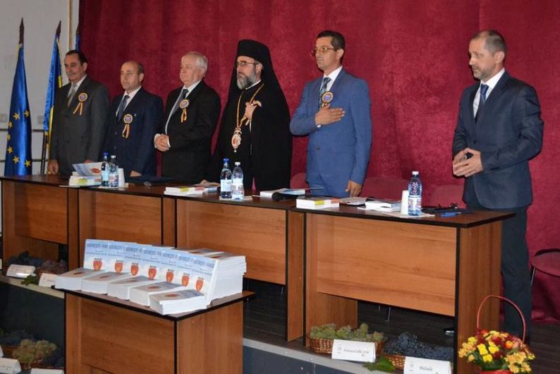 Foto: Dr. Ing. Ghică Mihu - directorul Stațiunii din Odobești, Dr. Ing. Ioan Marian - directorul Institutului de la Valea Călugărească, Dr. Ing. Gheorghe Glăman - președintele Secției de Horticultură a Academiei de Științe Agricole și Silvice București, IPS Ciprian - arhiepiscopul Buzăului și Vrancei, Daniel Nicolaș - primarul Orașului Odobești