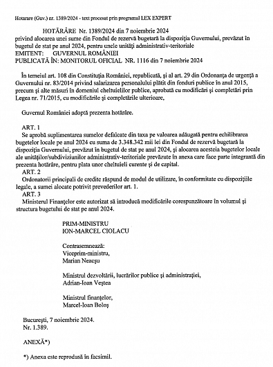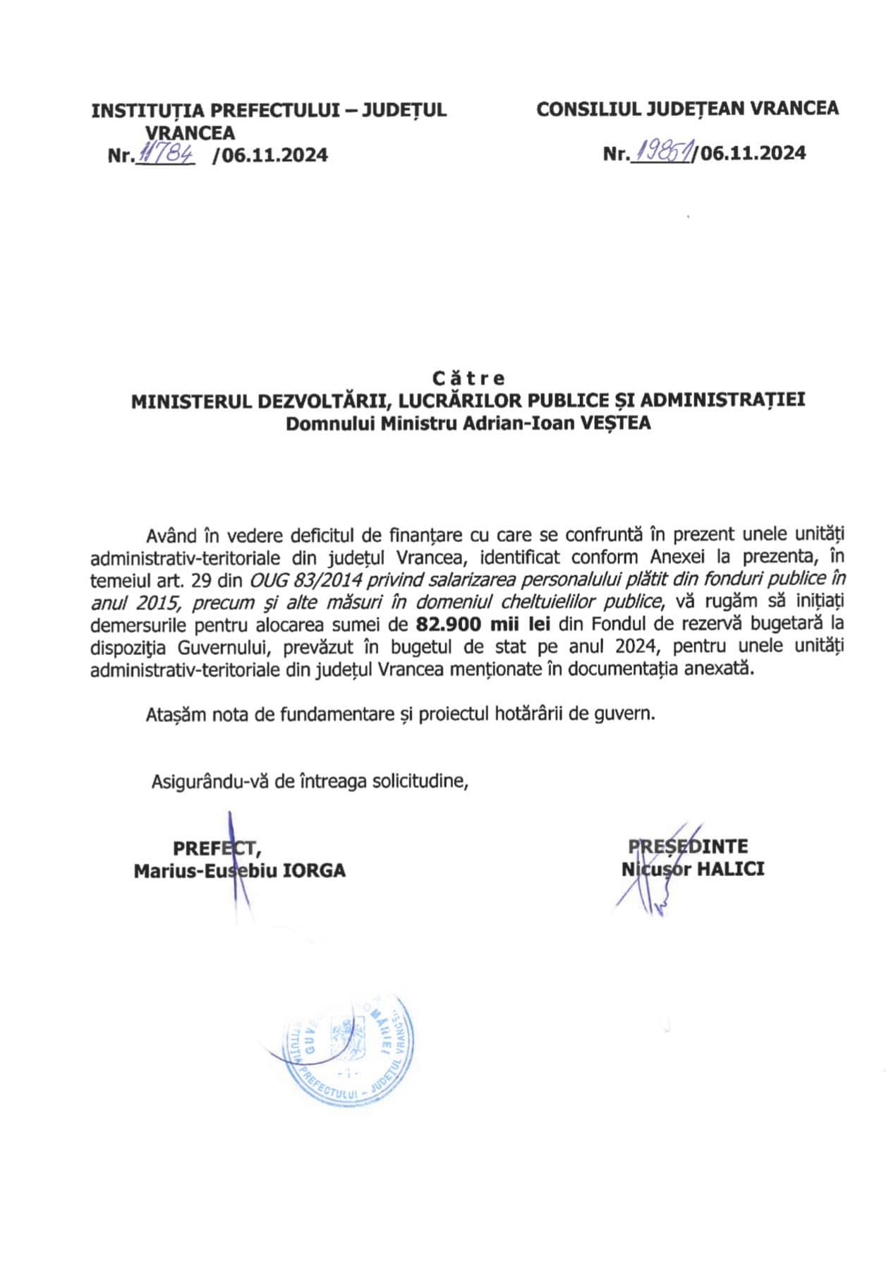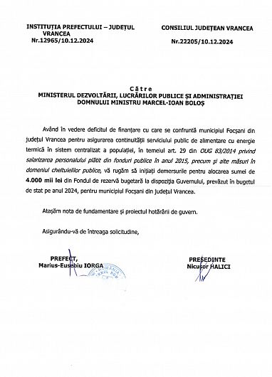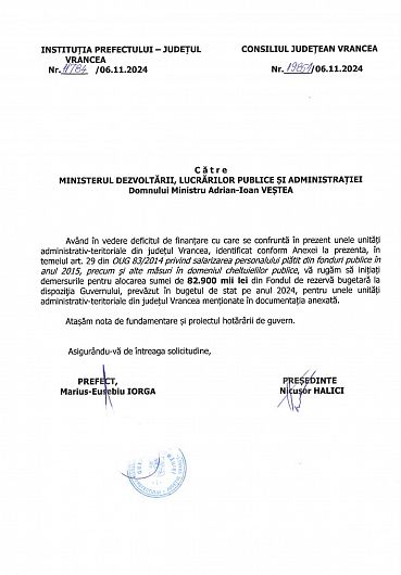 Cu puțin timp în urmă, spre finalul acestui an, la solicitarea președintelui Consiliului Județean Vrancea și a prefectului județului Vrancea, Guvernul României a răspuns prompt, alocând fonduri vitale pentru investiții și cofinanțarea proiectelor esențiale pentru dezvoltarea comunităților noastre, în valoare totală de 82,9 milioane de lei prin H.G. Nr. 1389/07.11.2024.