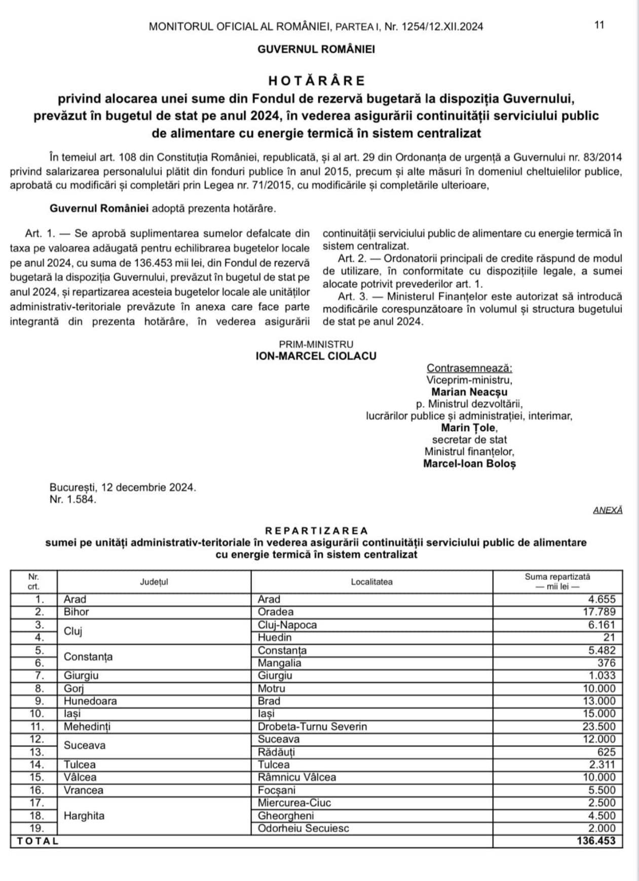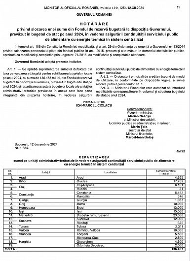 Ieri( n.r. joi 12 decembrie 2024), Guvernul a făcut încă un pas important pentru focșăneni: 5,5 milioane lei au fost alocați prin H.G. Nr. 1584/12.12.2024, pentru a asigura căldura și confortul atât în locuințe cât și în grădinițe, școli și licee, astfel încât să trecem peste iarnă fără grija agentului termic.