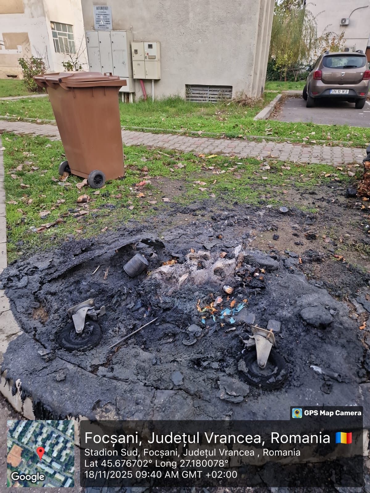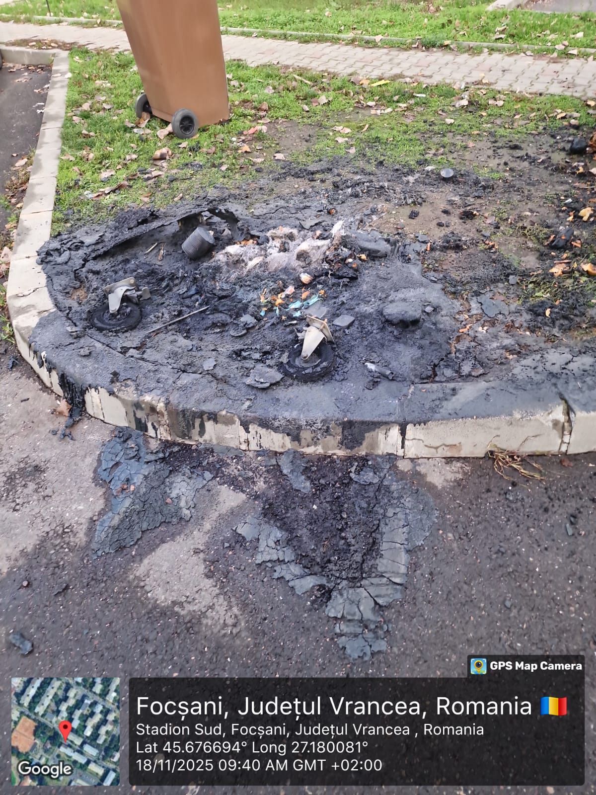 Informare de presă, miercuri 19 noiembrie 2025 ora 10:20, Asociația de Dezvoltare Intercomunitare (ADI) „Vrancea Curată”:A PATRA PUBELĂ DE 1100 L, INCENDIATĂ ÎN FOCȘANI