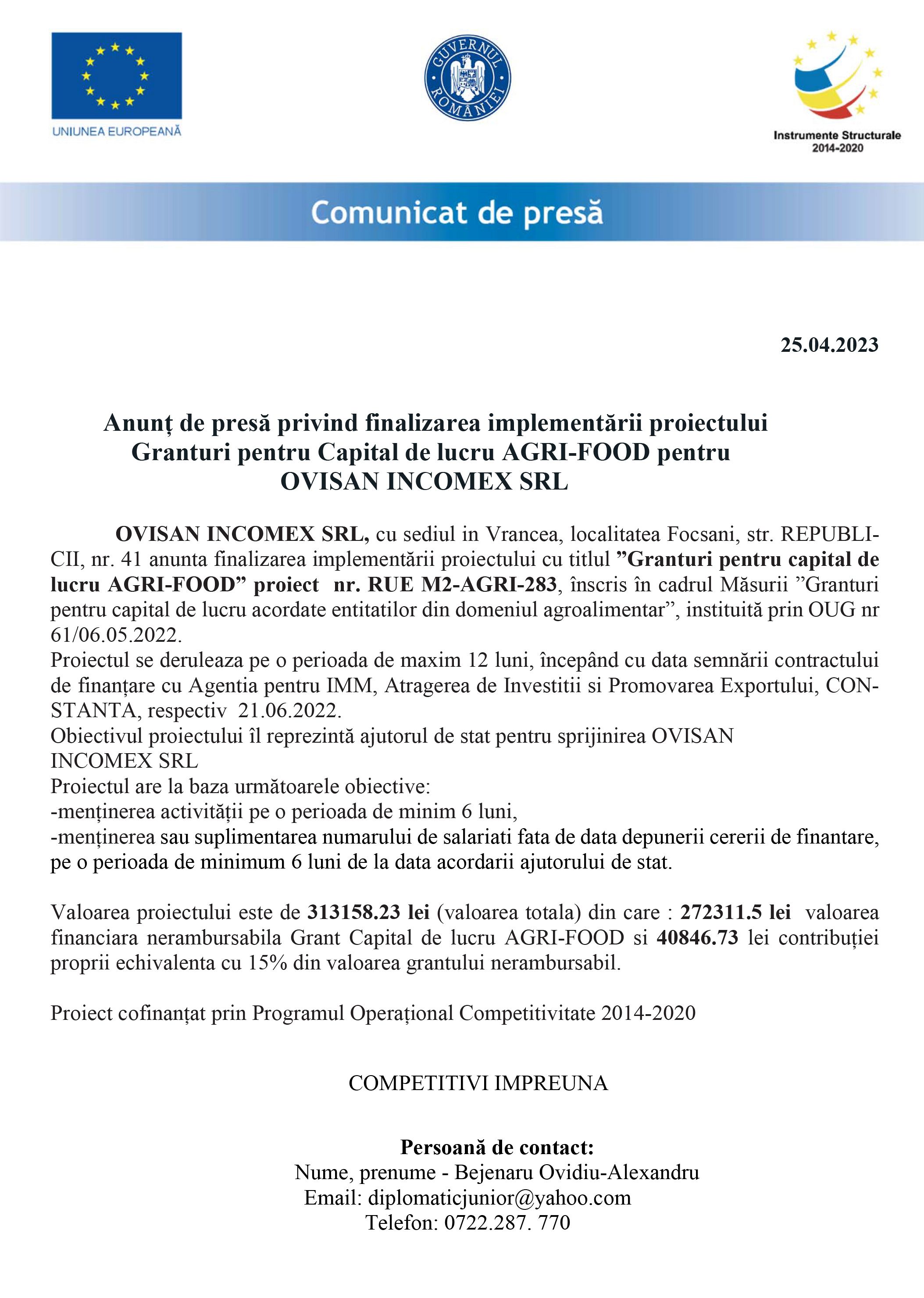 Anunț de presă privind finalizarea implementării proiectului Granturi pentru Capital de lucru AGRI-FOOD pentru OVISAN INCOMEX SRL