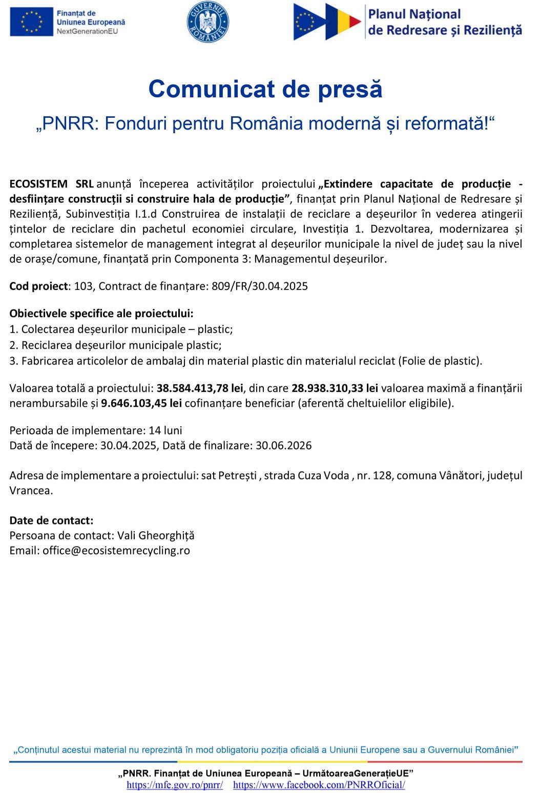 ECOSISTEM SRL anunță începerea activităților proiectului „Extindere capacitate de producție - desființare construcții si construire hala de producție”, finanțat prin Planul Național de Redresare și Reziliență, Subinvestiţia I.1.d Construirea de instalații de reciclare a deșeurilor în vederea atingerii țintelor de reciclare din pachetul economiei circulare, Investiția 1. Dezvoltarea, modernizarea și completarea sistemelor de management integrat al deșeurilor municipale la nivel de județ sau la nivel de orașe/comune, finanțată prin Componenta 3: Managementul deșeurilor.