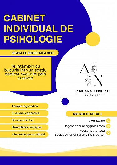 La doar 22 de ani, Adriana Nedelcu, o tânără logopedă din Focșani, și-a împlinit visul de a-și deschide propriul cabinet de logopedie. Cu o energie caldă și multă dorință de a aduce schimbări în viața celor mici, Adriana îi întâmpină pe copii și părinți într-un spațiu modern și prietenos, situat pe strada Anghel Saligny nr. 5, parter.