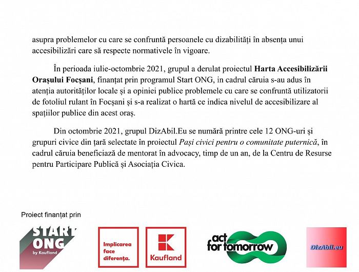 Grupul civic Dizabil.Eu Vrancea implementează, în perioada 1 octombrie - 3 decembrie, proiectul ”Informați Pentru O Viață Mai Bună”, proiect finanțat prin programul Start ONG, lansat de Kaufland România și implementat de Asociația Act for Tomorrow.