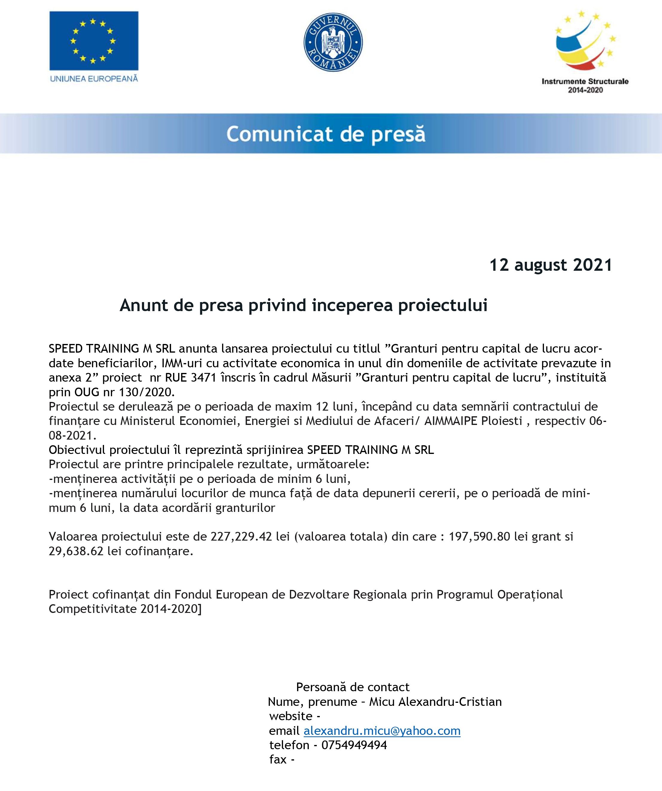Începere proiect “Grant pentru capital de lucru” SPEED TRAINING M SRL