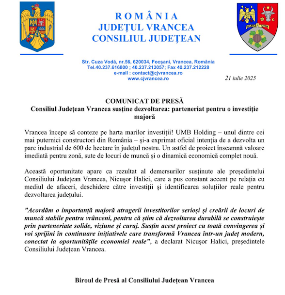 Citiți și conținutul integral al comunicatului de presă făcut public luni, 21 iulie 2025 de către Biroul de Presă al Consiliului Județean Vrancea în legătură cu această știre
