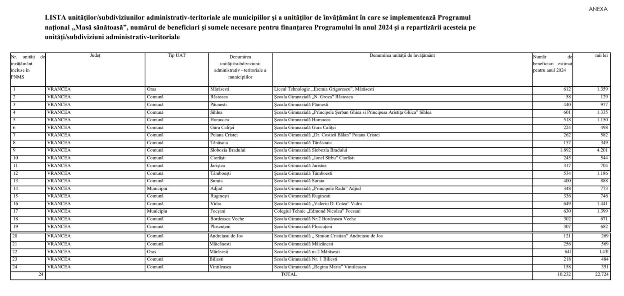 Ministerul Educației a pus în dezbatere publică un proiect de Hotărâre de Guvern pentru repartizarea sumei, prevăzută în bugetul de stat pe anul 2024, pentru finanțarea Programului Național „Masă Sănătoasă”. În total au fost incluse 1223 de școli din țară dintre care 24 din județul Vrancea, din trei orașe și douăzeci de comune, iar suma repartizată este de 1.019.223 mii lei din care 22.724 mii lei pentru județul Vrancea, potrivit Notei de fundamentare. De acești bani ar trebui să beneficieze 458.833 de elevi dintre care din județul Vrancea 10.232 de elevi.