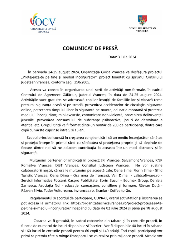 În perioada 24-25 august 2024, Organizația Civică Vrancea va desfășura proiectul „Protejează-te pe tine și mediul înconjurător”, proiect finanțat cu sprijinul Consiliului Județean Vrancea, conform Legii 350/2005.