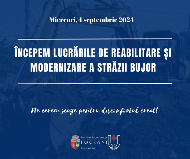Prin intermediul unei postări activată , marți 03 septembrie 2024 Primăria Municipiului Focșani anunță că de miercuri 04 septembrie 2024 începe lucrările de reabilitare și modernizare a străzii Bujor.
