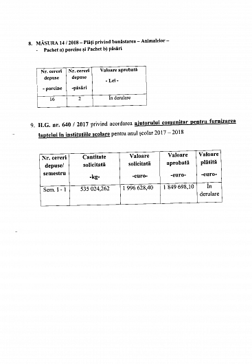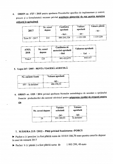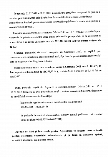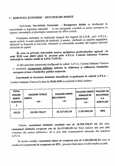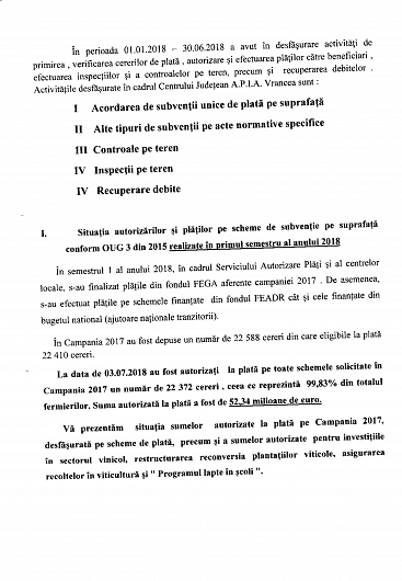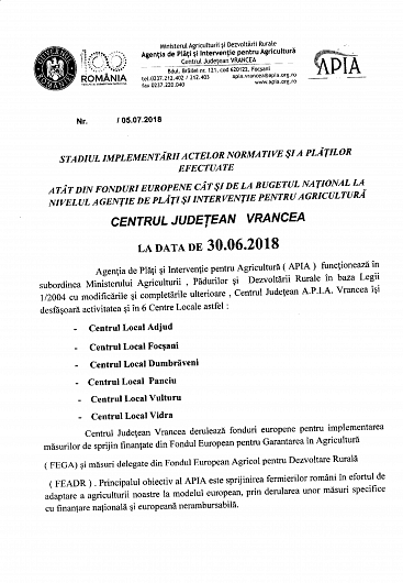 În ședința Colegiului Prefectural Vrancea din 19.07.2018 a fost prezentat Raportul cu privire la stadiul implementării actelor normative şi a plăţilor efectuate atât din fonduri europene cât şi de la bugetul naţional, la nivelul Centrului Județean Vrancea al Agenției de Plăți și Intervenție pentru Agricultură, la 30.06.2018.