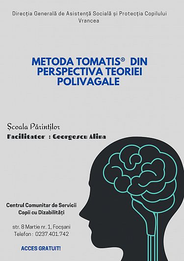 Direcția Generală de Asistență Socială și Protecția Copilului Vrancea (D.G.A.S.P.C. Vrancea), prin intermediul Centrului Comunitar de Servicii Copii cu Dizabilități Focșani, organizează workshop-ul cu tema „Metoda Tomatis din perspectiva Teoriei Polivagale”, în cadrul programului „Școala părinților”, workshop ce va avea loc vineri, 20 decembrie 2024, fiind susținut de Alina Georgescu, specialist certificat Tomatis Nivel 4.