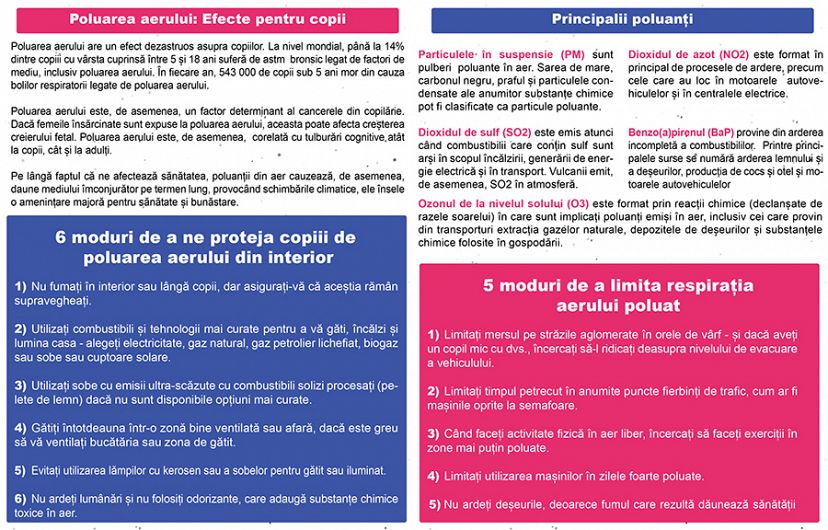 Poluarea aerului are un efect dezastruos asupra copiilor. La nivel mondial, până la 14% dintre copiii cu vârsta cuprinsă între 5 şi 18 ani suferă de astm bronșic legat de factori de mediu, inclusiv poluarea aerului. În fiecare an, 543 000 de copii sub 5 ani mor din cauza bolilor respiratorii legate de poluarea aerului.