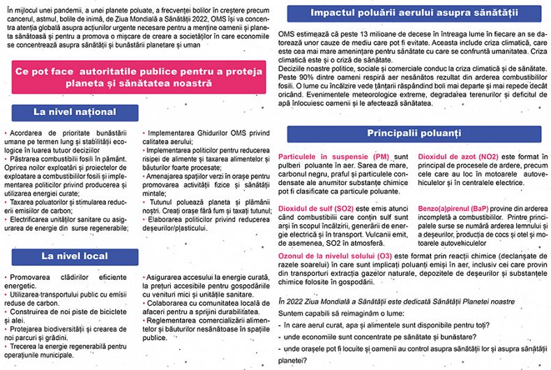 7 aprilie 2022 - Ziua Mondială a Sănătății - „Planeta noastră – Sănătatea noastră * Să înlăturăm poluarea aerului, apei și hranei!”