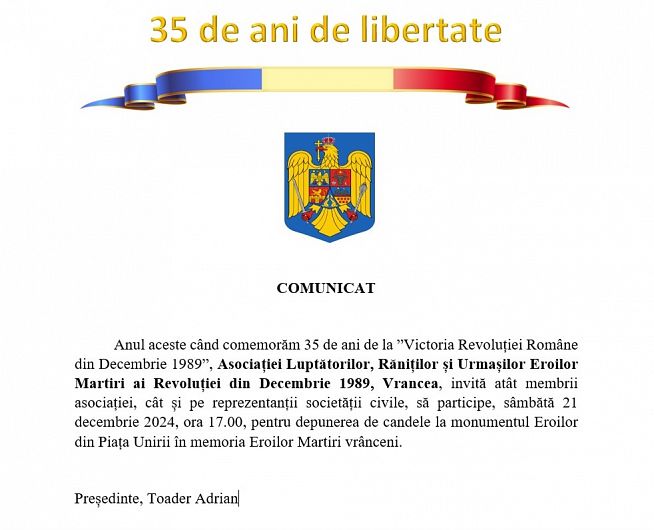 Și anul acesta membrii Asociației Luptătorilor, Invalizilor, Răniților, și Urmașii celor Decedați în Revoluția din decembrie 1989 – Vrancea, participă la manifestările organizate cu ocazia comemorării a 35 de ani de la Revoluția din Decembrie 1989. Ei vor fi prezenți la depunerea de coroane la monumentul eroilor revoluție din Piața Unirii, ridicat în memoria celor 9 tineri eroi martiri vrânceni: Ghinea Dorinel, Silvestru Jim, Voicu Nicolae, Milea Dumitru, Crețu Florin, Catană Marin, Dănăilă Gabi, Apostolie Vasile și Buruiană Valerică.