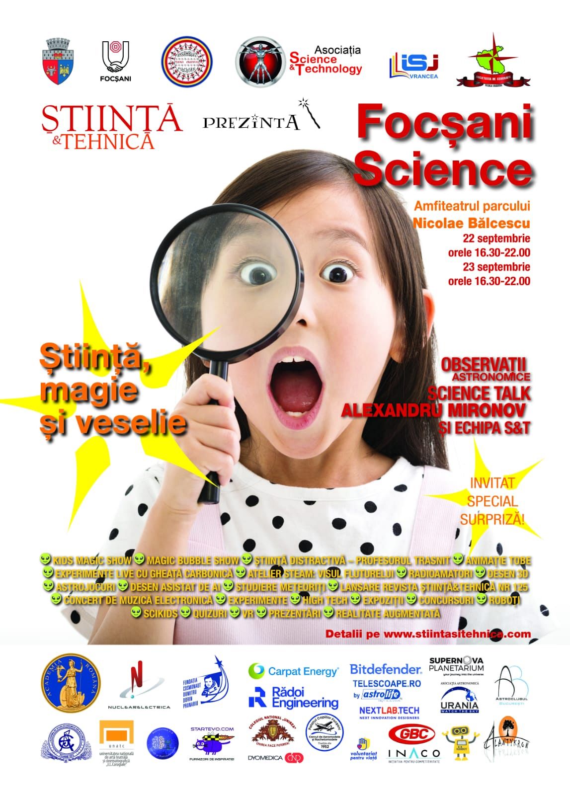 În Amfiteatrul Parcului N. Bălcescu din Focșani, în 22 și 23 septembrie, va avea loc prima ediția a festivalui #FocșaniScience. Evenimentul se adresează întregii familii și a aduce lunete si telescoape profesionale, experimente științifice live, show-uri de știință distractivă și conferințe pe înțelesul publicului. Organizatorii au pregătit și foarte multe ateliere interactive de la desene pe hârtie până la desen 3D, grafică asistată pe calculator, scanare cu laser, roboți, meteoriți și mașinuțe solare. Vor fi trei zone: ateliere, scena și observații astronomice. Accesul este gratuit!