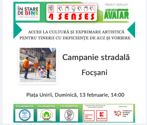 Campania stradală „Acum mă auzi?” are loc duminică, 13 februarie 2022, între orele 14:00 și 17:00, în Piața Unirii din Focșani. Campania este organizată de Asociatia neguvernamentală „Avatar” și se desfășoară în cadrul proiectului „4 SENSES” care facilitează accesul la produse culturale pentru tinerii cu deficiențe de auz și vorbire și sprijină exprimarea artistică a acestora. Ce spun organizatorii despre eveniment: