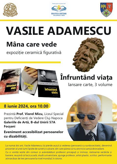 Prin intermediul unui comunicat de presă Biblioteca Județeană Vrancea anunță organizarea împreună cu Asociația Nevăzătorilor din România, filiala județeană Vrancea și în colaborare cu Muzeul Vrancei a unui eveniment în premieră pentru Focșani, sâmbătă, 8 iunie 2024, ora 10.00, la Galeriile de Artă.În cadrul evenimentului se va desfășura expoziția de ceramică figurativă, semnată de Vasile Adamescu - „Mâna care vede", accesibilizată persoanelor cu dizabilități. De asemenea, va avea loc lansarea de carte „Înfruntând viața" 3 volum, autor Vasile Adamescu. Evenimentul va fi prezentat de domnul prof. Viorel Micu (Liceul Special pentru Deficienți de Vedere Cluj-Napoca).Citiți în continuare conținutul integral al comunicatului de presă menționat.