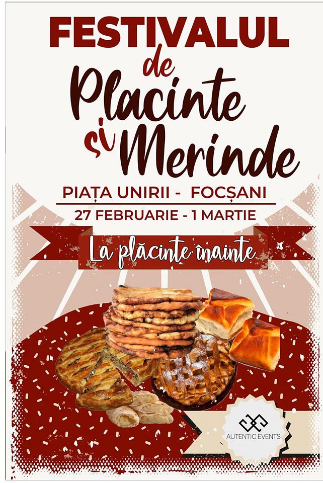 Festivalul de plăcinte și merinde din Piața Unirii din Focșani va avea loc în weekendul 28 februarie - 1 martie 2020 și este anunțat prin intermediul unui evenimnet creat pe facebook de către organizatorul Autentic Events.Redăm în continuare detaliile acestui eveniment prezentat de organizator.
