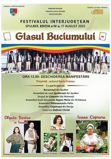 Comuna Spulber se pregătește pentru o nouă sărbătoare a tradițiilor vrâncenești. Duminică, 17 august 2025, de la ora 12.00, va avea loc cea de-a IV-a ediție a Festivalului Folcloric „Glasul Buciumului”, eveniment organizat de Consiliul Județean Vrancea, prin Centrul Cultural Vrancea, în parteneriat cu Primăria Spulber.