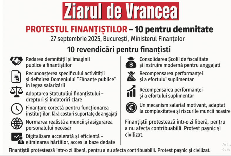 Focșani, 24 septembrie 2025 – Sindicatul Național Finanțe Publice – SindFISC a anunțat organizarea unui protest de amploare sâmbătă, 27 septembrie 2025, între orele 12:00–14:00, în fața sediului Ministerului Finanțelor din București.La manifestație vor participa reprezentanți ai organizațiilor sindicale teritoriale din toate structurile Ministerului Finanțelor, inclusiv din cadrul AJFP Vrancea, SFO Panciu și SFM Adjud, alături de delegați din aparatul central al ANAF, Direcția Generală Antifraudă Fiscală, Direcția Marilor Contribuabili și alte instituții subordonate.