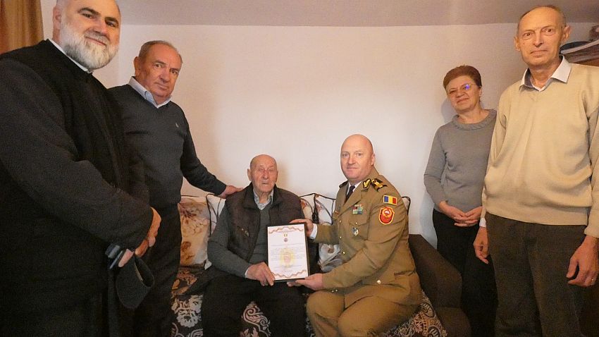 Veteranul Soare Dediu, născut în comuna Măicănești, a fost sărbătorit în prezența autorităților locale, a reprezentanților Armatei Române și a familiei sale.