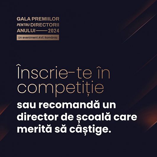 Directorii unităților de învățământ publice din România se pot înscrie pentru Gala Premiilor pentru Directorii Anului 2024 online până pe 10 iulie 2024 (ora 23:59). Organizat de AVE (Asociația pentru Valori în Educație) pentru al optulea an consecutiv, evenimentul pune în prim-plan realizările directorilor din liceele, școlile și grădinițele publice din România. Sunt eligibili pentru înscriere toți directorii și directorii adjuncți în funcție în anul școlar 2023 – 2024, mai puțin cei care au fost premiați la edițiile anterioare ale Galei.