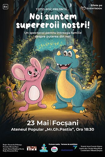 Ateneul Popular „Mr. Gh. Pastia” va găzdui vineri, 23 mai, de la ora 18:30, un eveniment cultural cu totul special, dedicat familiilor din Focșani și împrejurimi. Este vorba despre spectacolul educativ și interactiv „Noi suntem super eroii noștri”, pus în scenă de Asociația Tzitzi-Poc, aflată în plin turneu național în perioada 4 – 28 mai 2025.