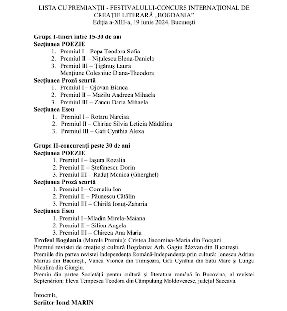 Domnul Ionel Marin, directorul Festivalul-concurs literar BOGDANIA a reafirmat că Festivalul stimulează şi încurajează interesul pentru limba română, pentru creaţia literară originală şi respectul pentru valorile moştenite, pentru dezvoltarea spiritului competitiv şi a dorinţei de afirmare, precum şi promovarea în reviste şi antologii a câştigătorilor şi a creaţiilor valoroase, la fiecare dintre cele trei secţiuni: poezie, proză şi eseu. Vrem să cultivăm pacea, iubirea, talentul şi cultura română. România merită un viitor mai bun!