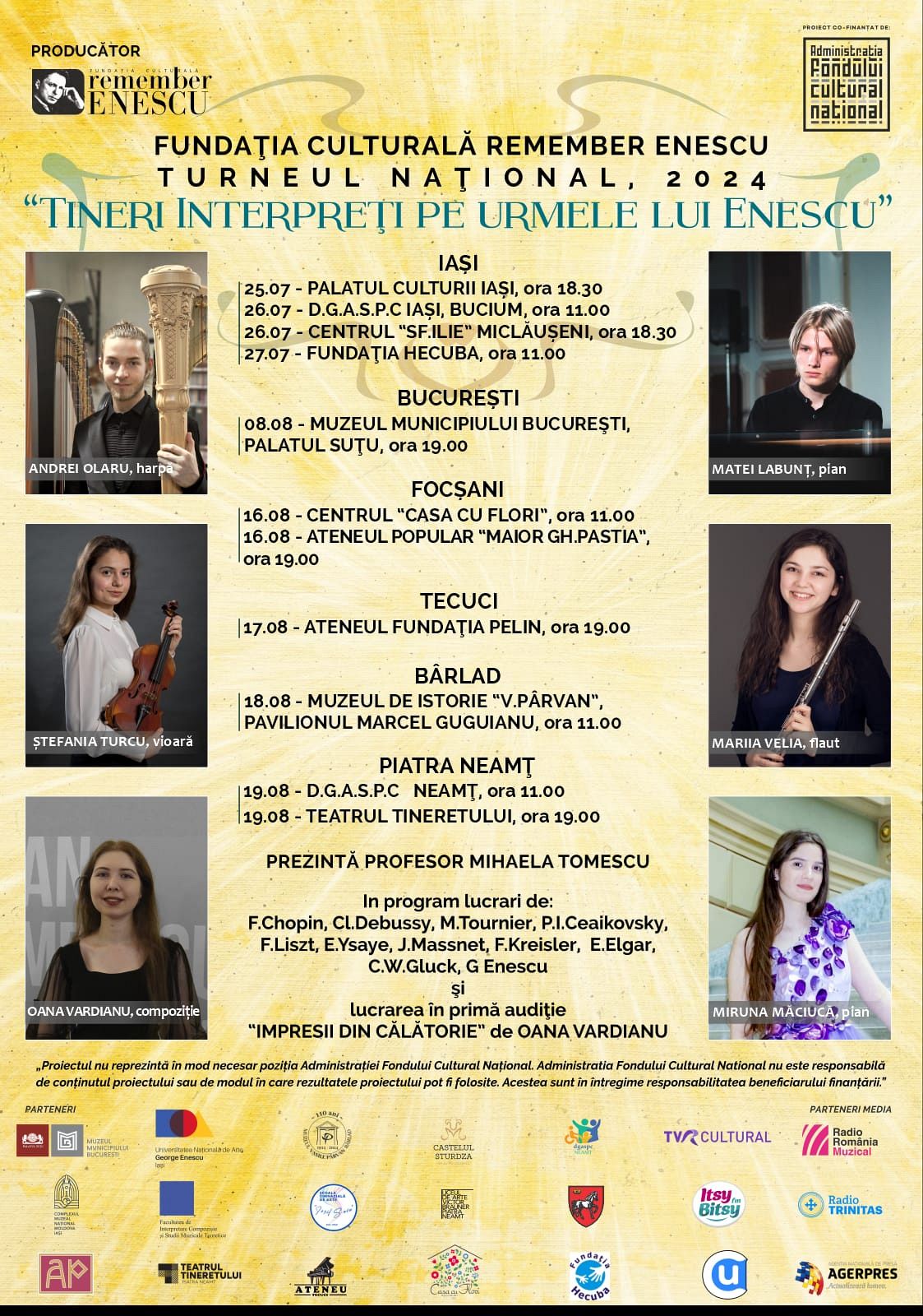 Sub egida Fundației Culturale „Remember Enescu”, condusă cu pasiune de profesoara Mihaela Tomescu, un nou proiect co-finantat de Adminstrația Fondului Cultural Național, va începe pe data de 25 iulie 2024, la Iași, urmarind trasee enesciene.