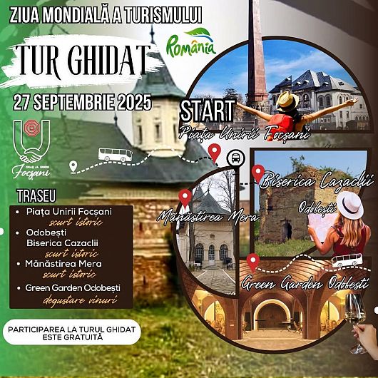 Focșănenii și oaspeții orașului sunt invitați sâmbătă, 27 septembrie 2025, să participe la un tur ghidat special organizat de Primăria Municipiului Focșani, prin Centrul Național de Informare și Promovare Turistică (CNIPT), în colaborare cu Primăria Odobești și Protoieria 1 Focșani, cu prilejul Zilei Mondiale a Turismului.