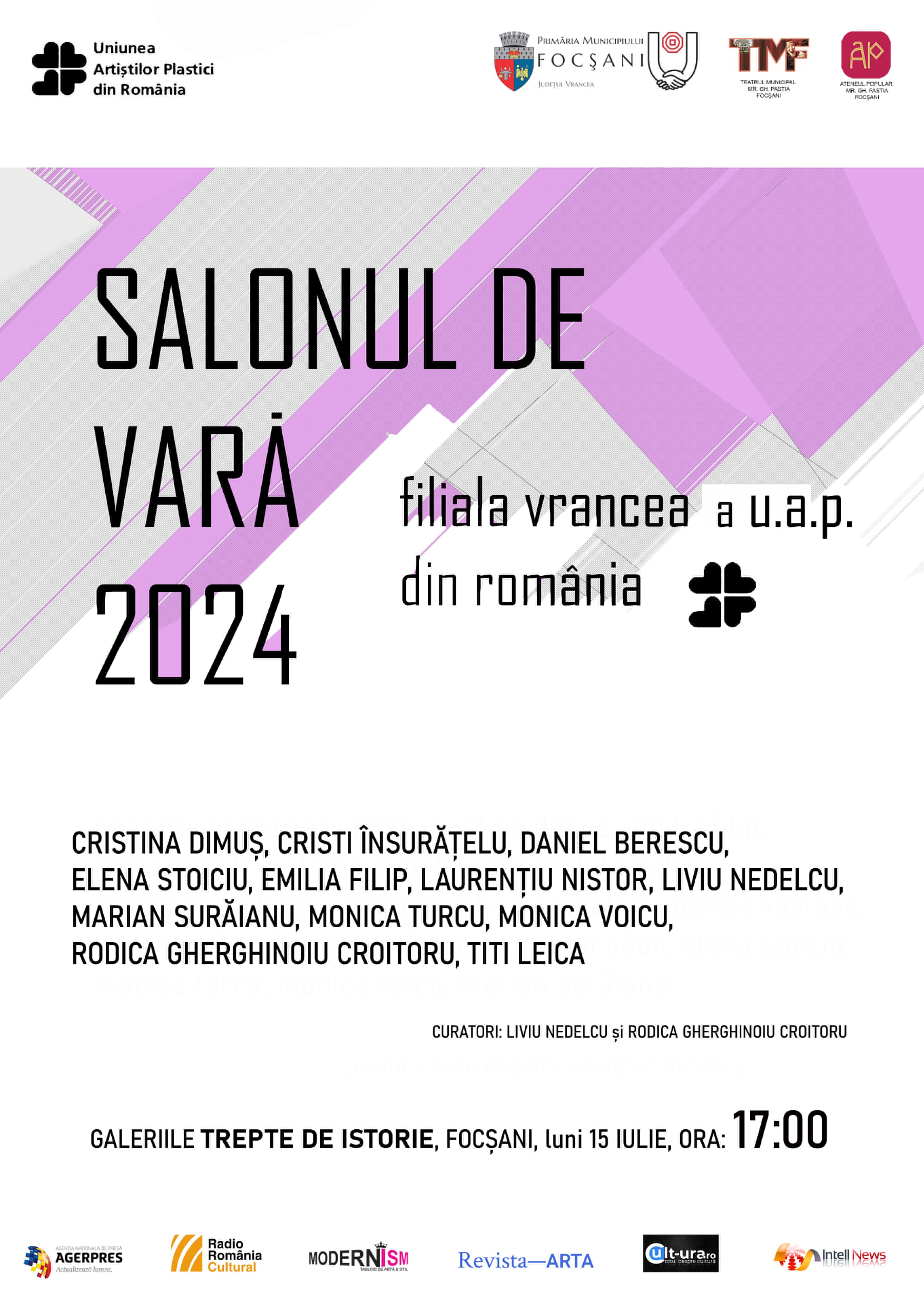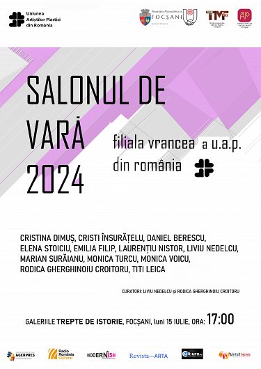 Filialei Vrancea a Uniunii Artiștilor Plastici (UAP)din România și Ateneul Popular „Mr. Gh. Pastia” sub egida Primăriei Municipiului Focșani, organizează la Galeria „Trepte de istorie”, din Focșani, „Salonul de vară” al Filialei Vrancea a Uniunii Artiștilor Plastici( UAP) din România.