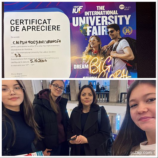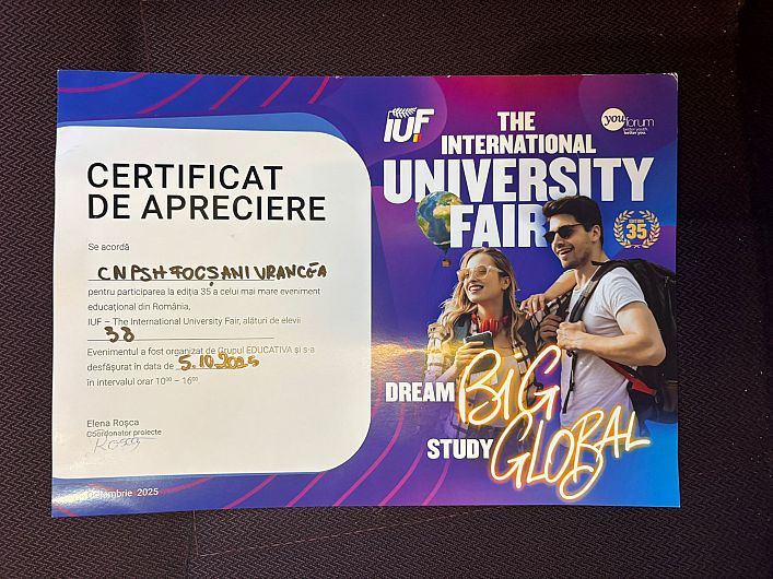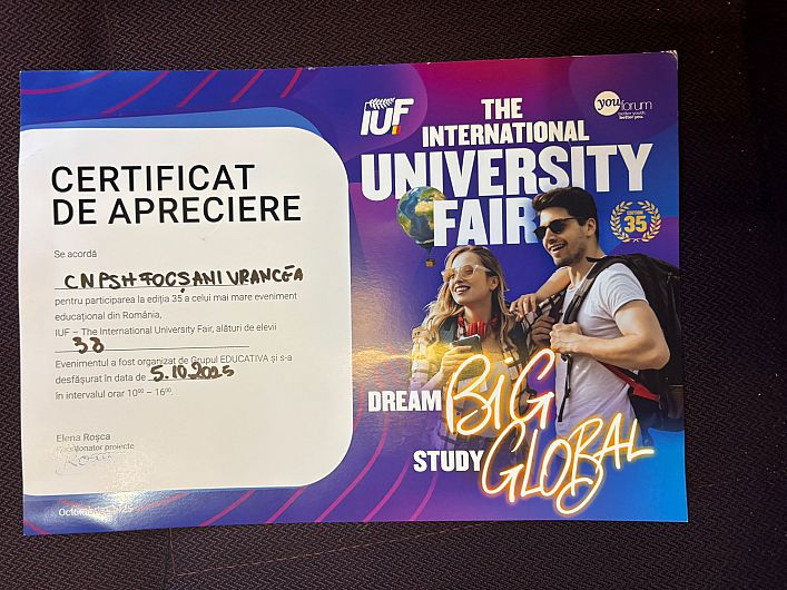 Elevii claselor a XI-a și a XII-a de la Colegiul Național Pedagogic „Spiru Haret” Focșani, însoțiți de profesorii Natașa Simion, directorul unității, și Olga Ostafi, au participat în data de 5 octombrie 2025 la ediția a 35-a a celui mai mare eveniment educațional din România, The International University Fair (IUF), desfășurat la București.