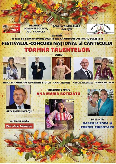 Zeci de copii talentați din mai multe județe ale țării au urcat pe scena Căminului Cultural din Golești, la prima ediție a festivalului-concurs „Toamna Talentelor”. Marele trofeu a fost câștigat de o tânără din Ilfov, iar organizatorii promit ca evenimentul să devină o tradiție în Vrancea.