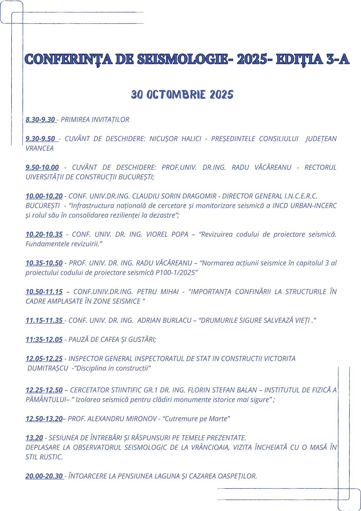 Focșaniul devine, joi, 30 octombrie 2025, capitala seismologiei românești. Începând cu ora 9.30, în sala mare a Consiliului Județean Vrancea (sediul vechi din Piața Unirii), se va desfășura Conferința de Seismologie – ediția a III-a, un eveniment științific de anvergură dedicat cercetării seismice, rezilienței la dezastre și siguranței construcțiilor.