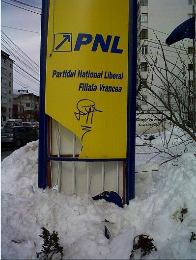 Căderile de zăpadă şi ţurţuri au făcut pagube şi la liberalii lui Nini. Sigla partidului a fost pur şi simplu spartă de o avalanţă de pe acoperişul blocului cu opt etaje.