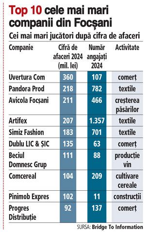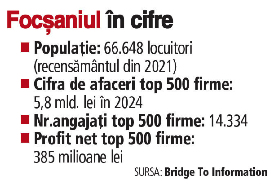 Datele analizate de ZF arată că în municipiul Focșani sunt active peste 11.000 de companii. Top 500 de firme locale au raportat în 2024 o cifră de afaceri cumulată de 5,8 miliarde de lei, un profit net de 385 milioane de lei și peste 14.000 de angajați, potrivit datelor furnizate de Bridge to Information.