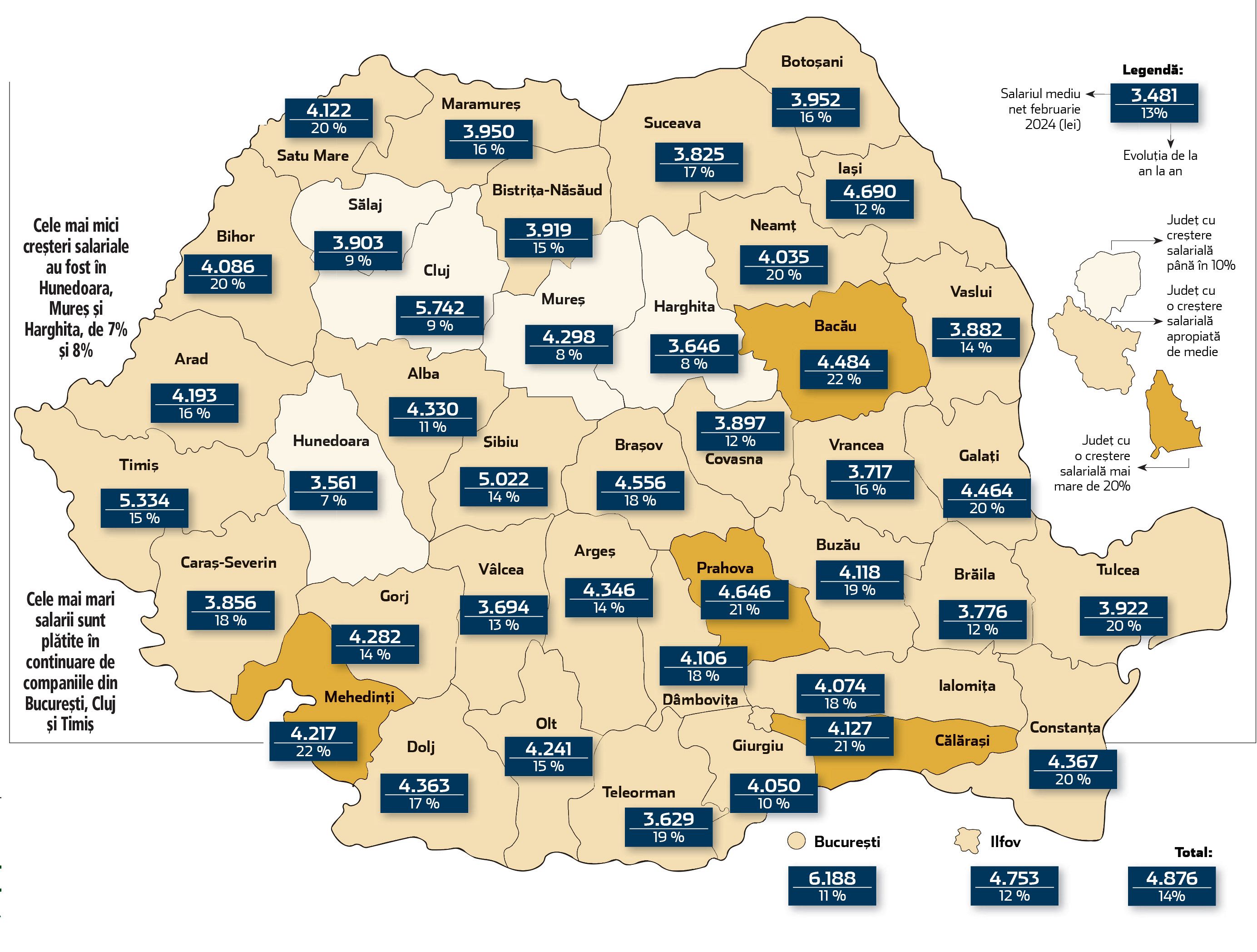 Judeţele Bacău, Mehedinţi şi Călăraşi au avut cele mai mari creşteri ale salariului mediu net în februarie 2024 comparativ cu februarie 2023, depăşind pragul de 21%. În aceste judeţe, salariile au ajuns să depăşească 4.000 de lei. În mod specific, în judeţul Bacău, veniturile medii nete ale angajaţilor au crescut de la aproximativ 3.700 de lei în februarie 2023 la aproape 4.500 de lei în aceeaşi lună din 2024.